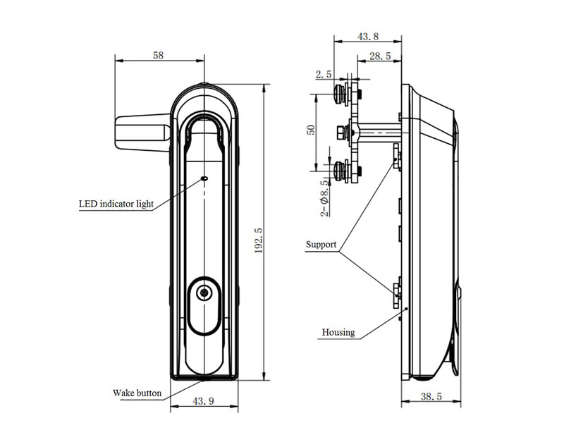 3. Открытие ключа: используйте пятиугольный ключ, чтобы открыть пылезащитный колпачок. Чтобы открыть замок, вставьте электронный ключ, поверните цилиндр замка по часовой стрелке и потяните за ручку. Поверните ключ на 45° , чтобы обеспечить автоматическую блокировку после закрытия ручки.